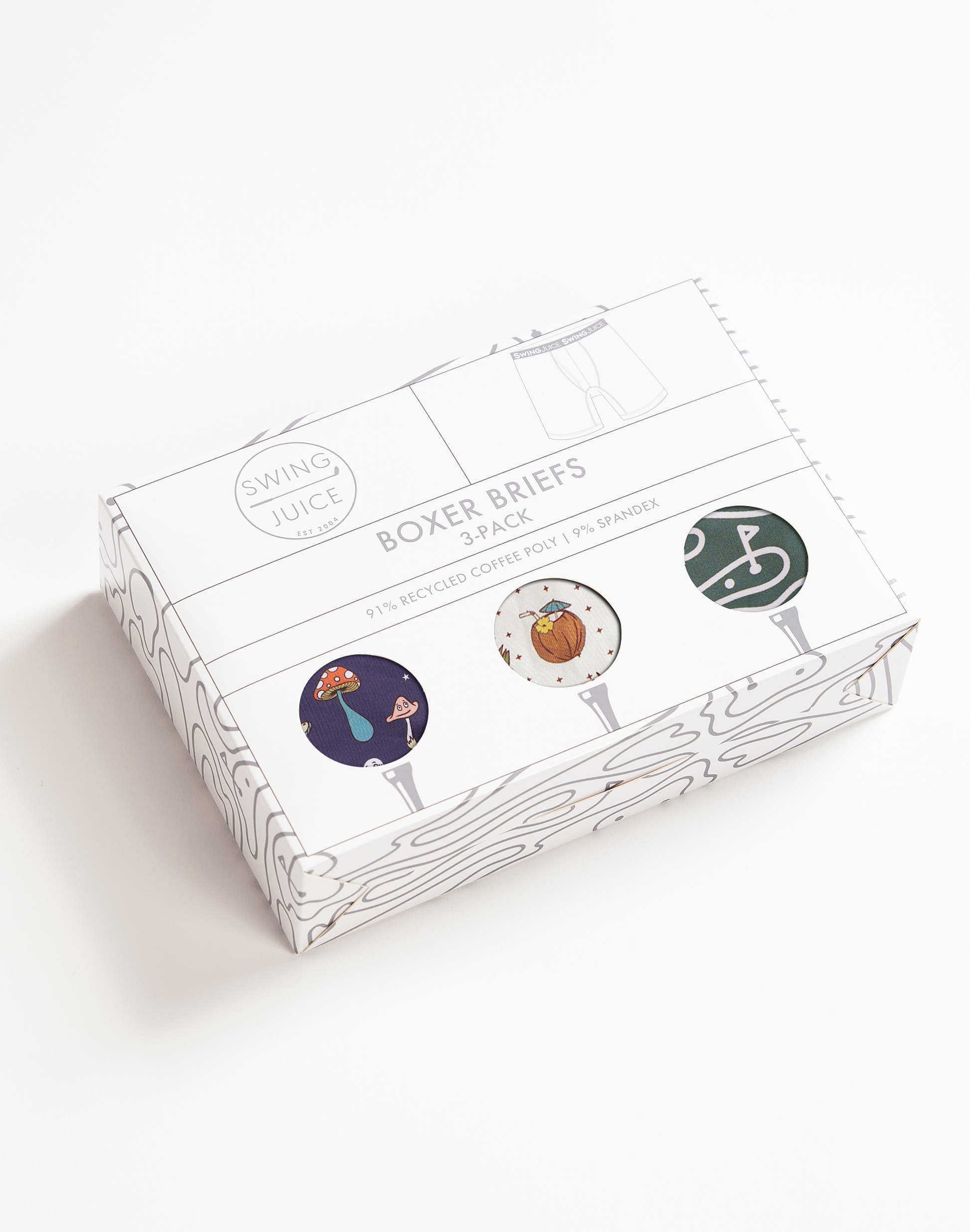 Stay stylish and comfortable with the Golf 6" Boxer Brief 3-Pack Fashion. These boxer briefs are made with S.Café® eco-friendly fabric for moisture-wicking and odor-busting benefits, plus super stretch for enhanced performance. This pack features fashionable designs: Golf & Tiki, Magic Mushrooms, and Golf Rhythmic Lines.